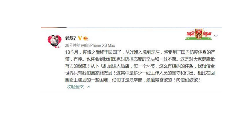 中国男足即将重返2022世界杯预选赛40强赛的赛场,球队核心武磊也终于从西班牙回到了国内。回国后,他在个人社交媒体上发文,赞扬祖国在防疫工作上所取得的成就。